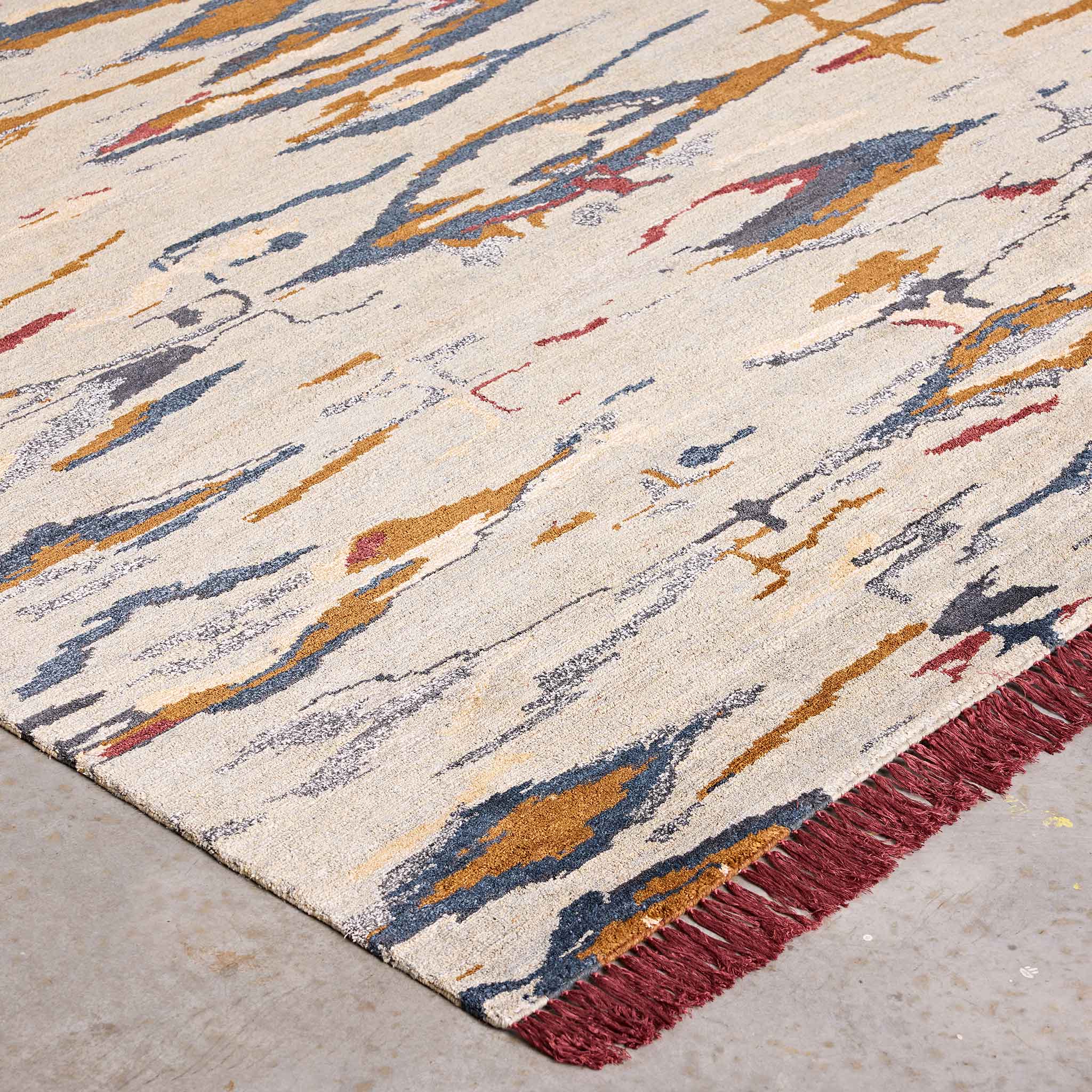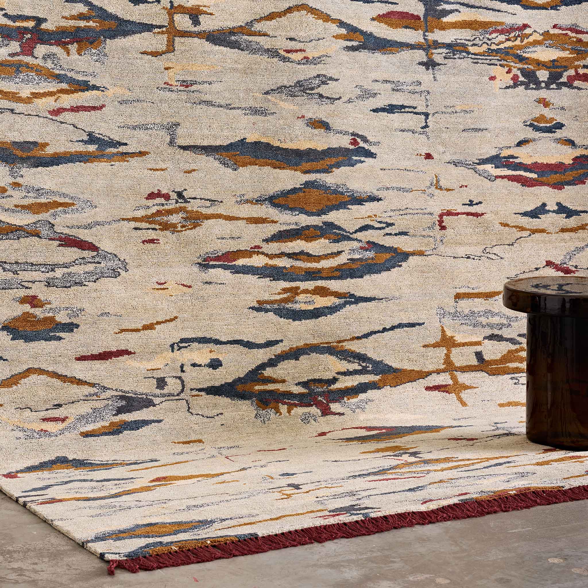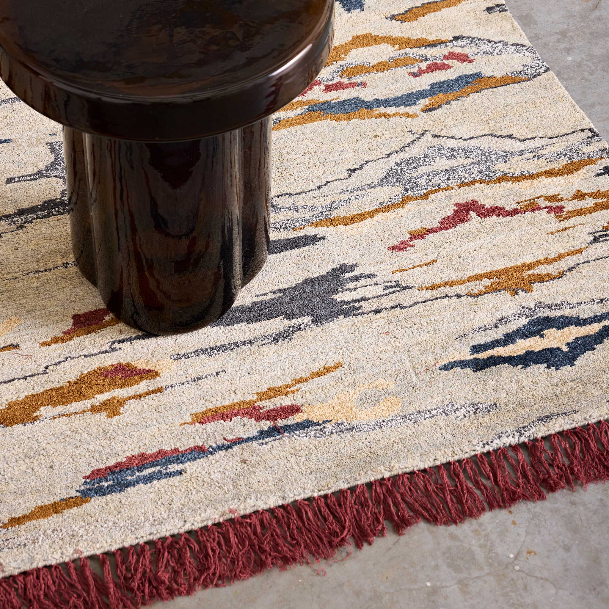 Hand-knotted by artisans in Nepal in hemp, and art-silk, organic shapes cascade across it and burgundy fringing features on the width edges.