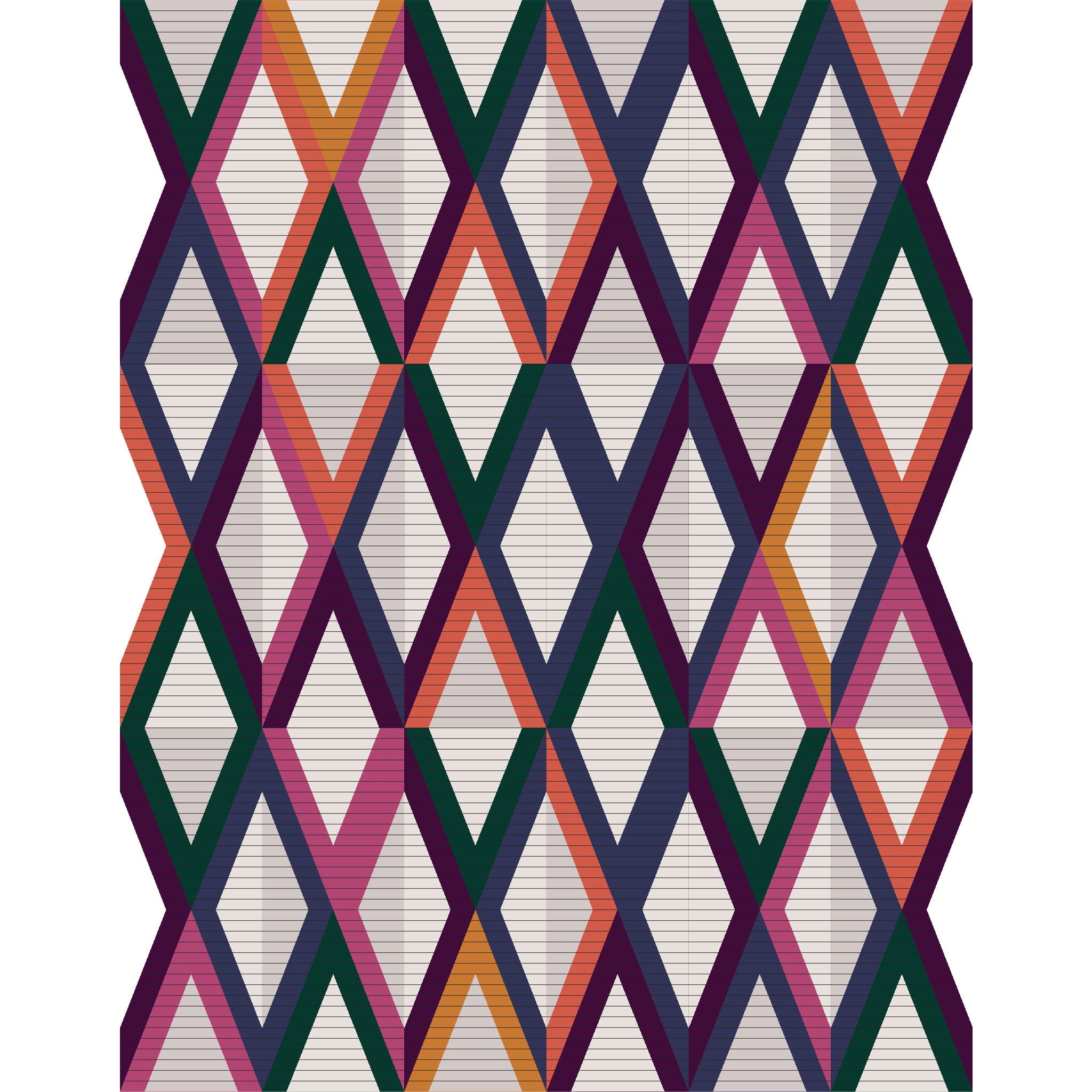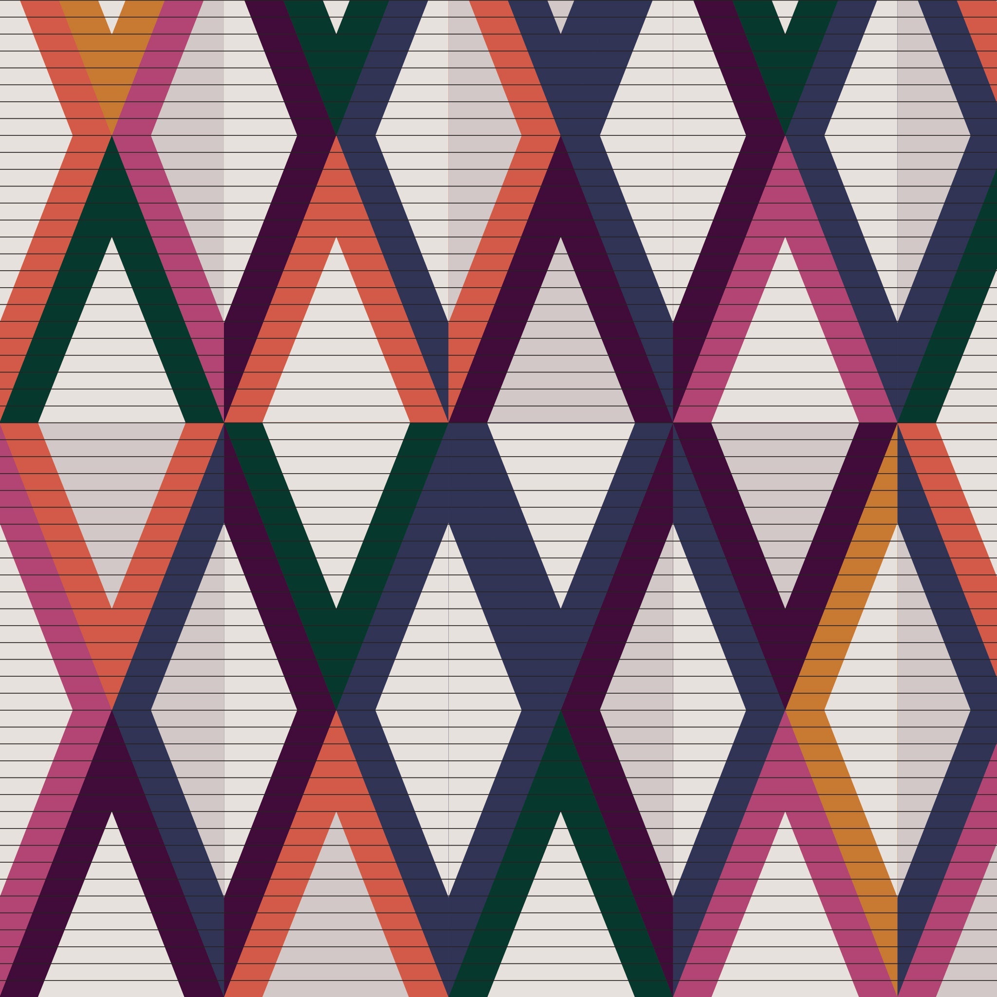 This design features rhythmic alternation of vibrant panels that echo the intensity of coloured urban light. Base areas of grey provide contrast, which is further juxtaposed with raised black felted wool lines to enhance the visual and textural organisation.