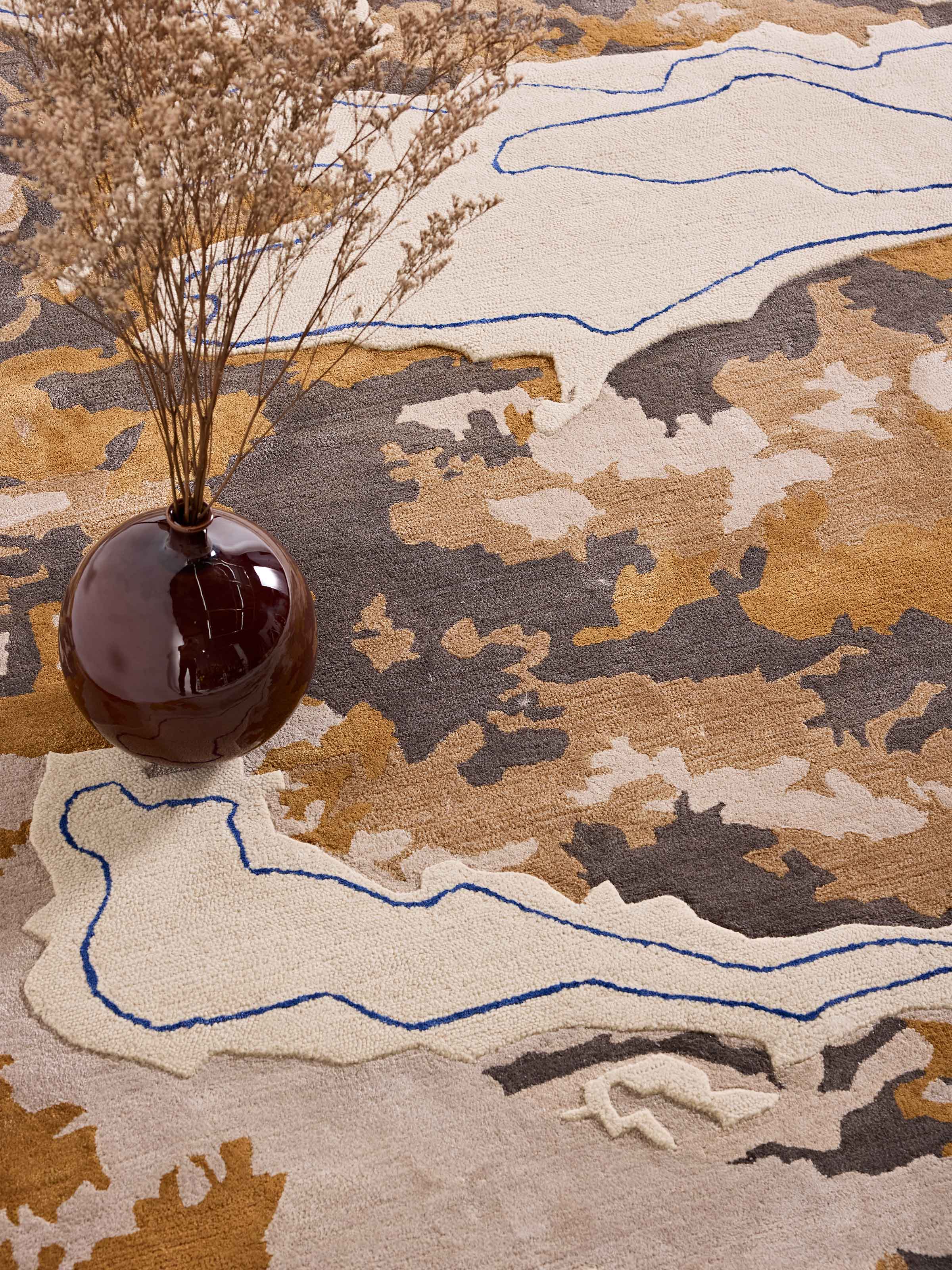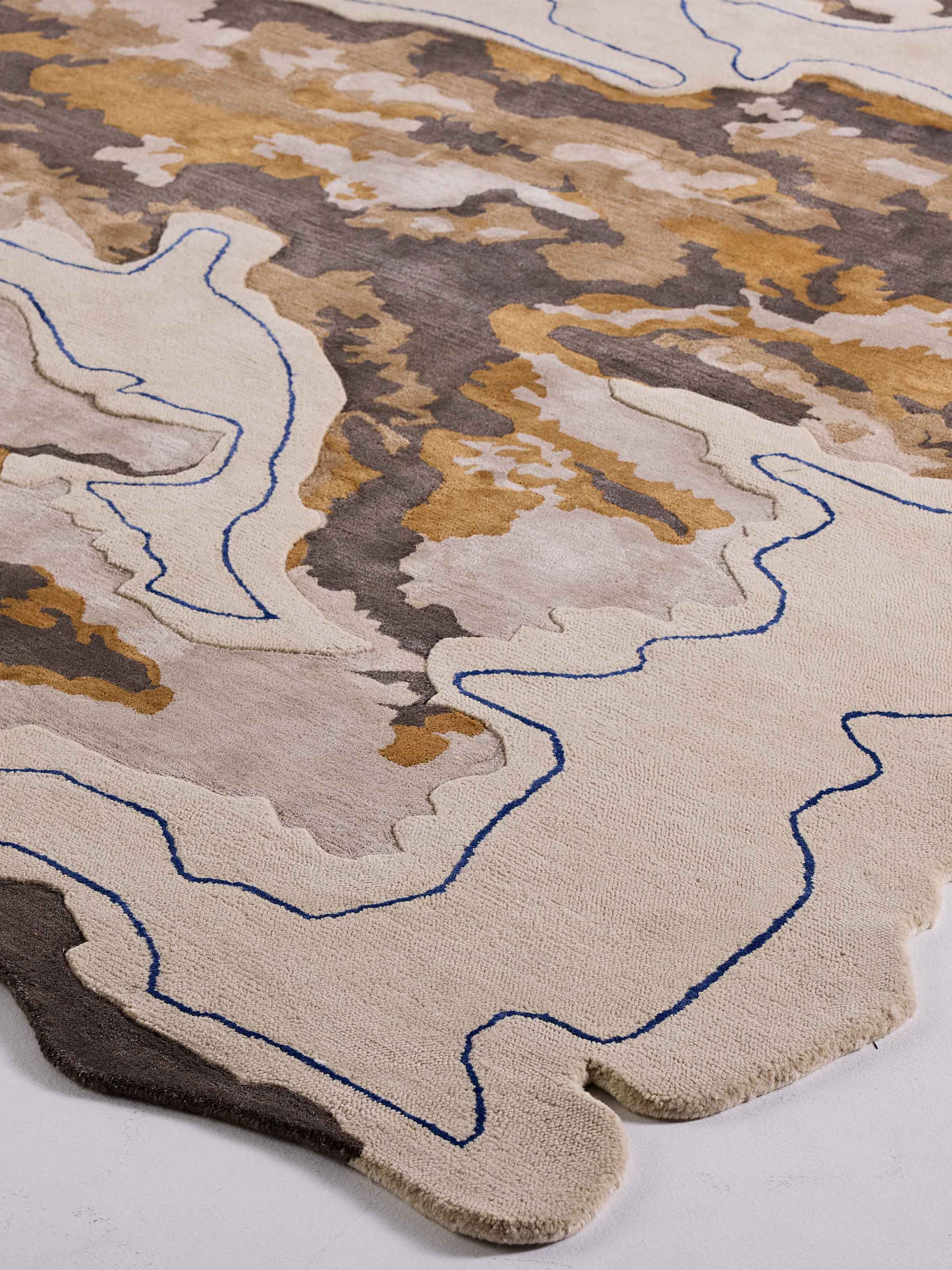 “Serving as a symbolic representation of its innovative design philosophy. Inspired by the company's affinity for raw materials like concrete and cement, the carpet blends rough and smooth textures, embodying the fus ion of industrial aesthetics with modern elegance. In line with Ethereall's commitment to balancing the raw and the refined, the carpet features a striking contrast between clean-looking materials and rough textures. The monochromatic color palette, consisting of shades of grey and muted tones, aligns seamlessly with the company's preference for sophisticated and calming spaces. Pops of carefully chosen vibrant accents infuse energy and personality into the design, breaking the monotony and creating focal points within the space. Abstract patterns, inspired by the interplay of light and shadow on concrete surfaces, add a dynamic and artistic dimension, reflecting Ethereall's dedication to pushing the boundaries of modem interior aesthetics. In its entirety, this bespoke carpet stands as a tangible expression of Ethereall's commitment to innovation, elegance, and distinctive design language.”