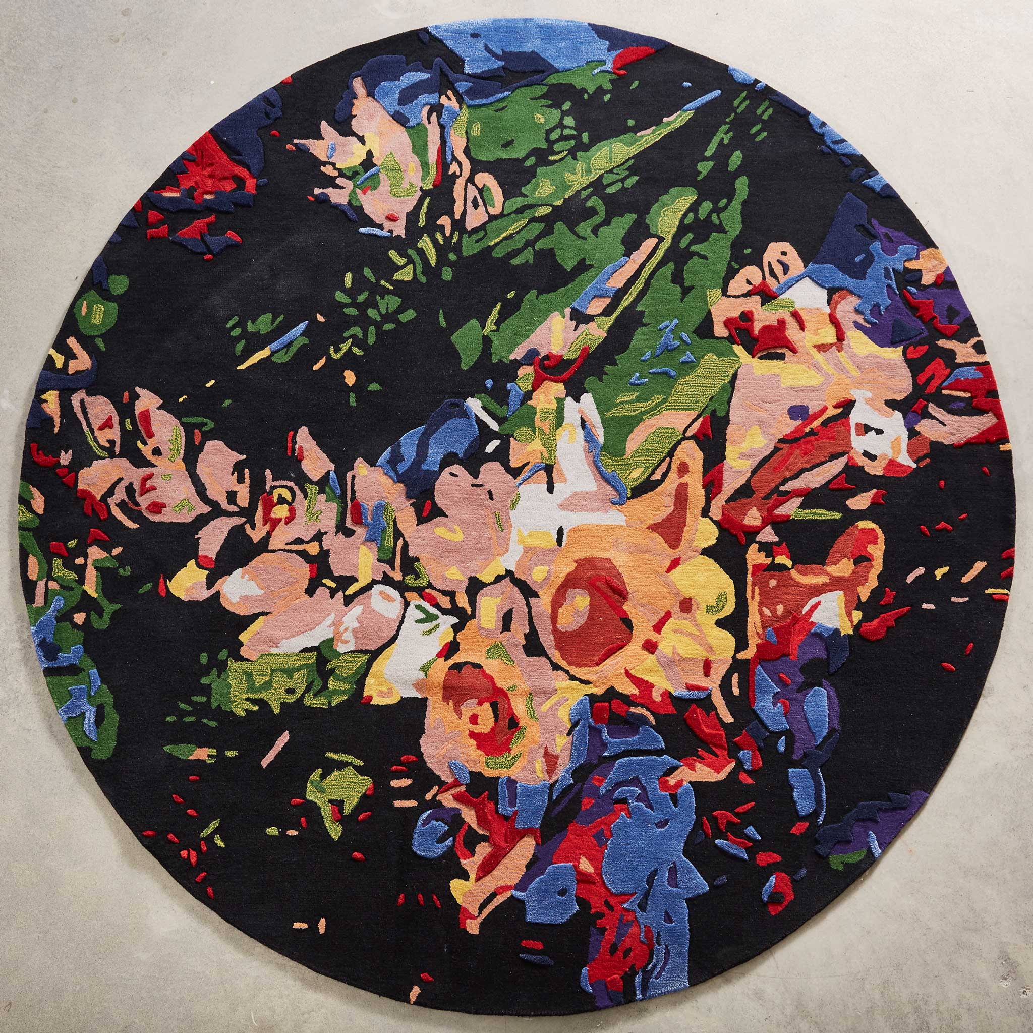 “Is a play on an early 19th century Still Life Painting and a fascination with pyrotechnics. The scale is enlarged, the colour is turned all the way up and the whole design is overlaid with cracks and smudges to create an explosion of colour. The flowers shoot up like fireworks in a night sky!” – Kerrie Brown