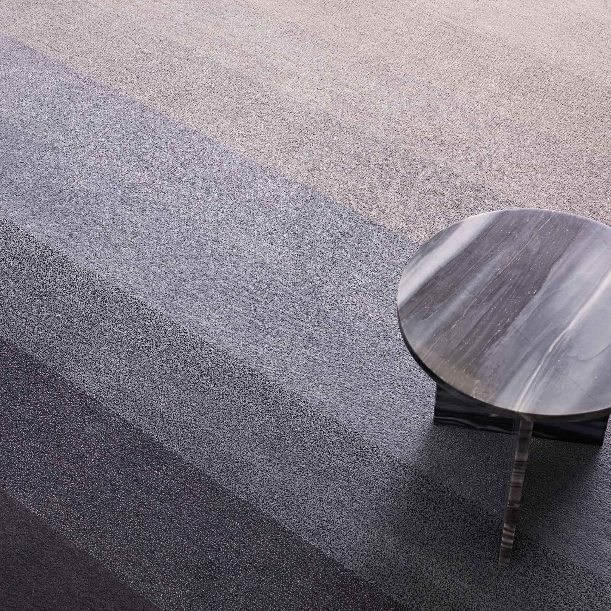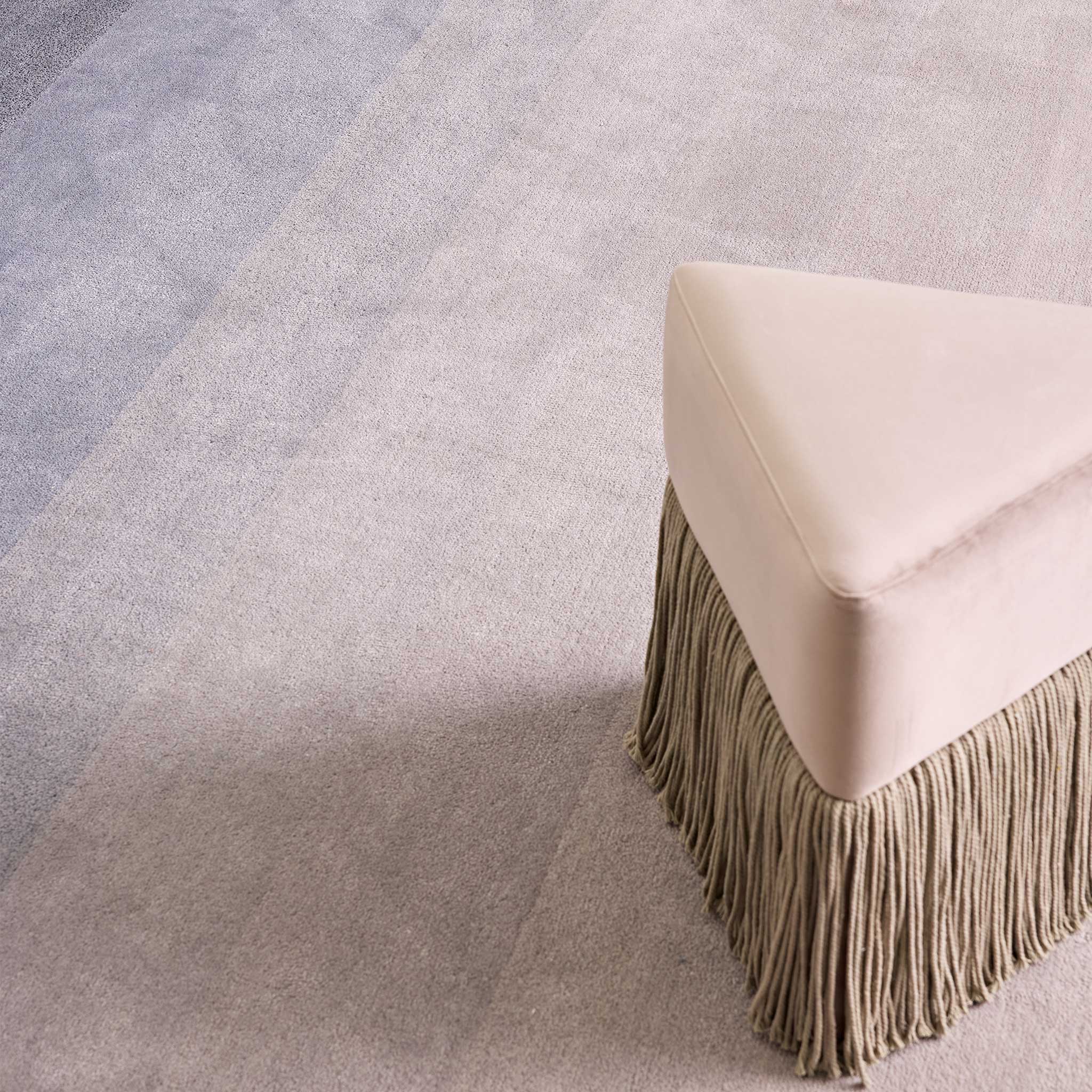 Crafted with deliberate artistry, the Tappeti Gradient Graphite achieves its nuanced transitions through carefully specified stippled areas within its hand-tufted wool and art-silk construction. This intentional technique softens the boundaries between solid color fields, allowing the delicate shift from light grey to deep charcoal to unfold with a visual smoothness reminiscent of the blended tones in a graphite drawing.