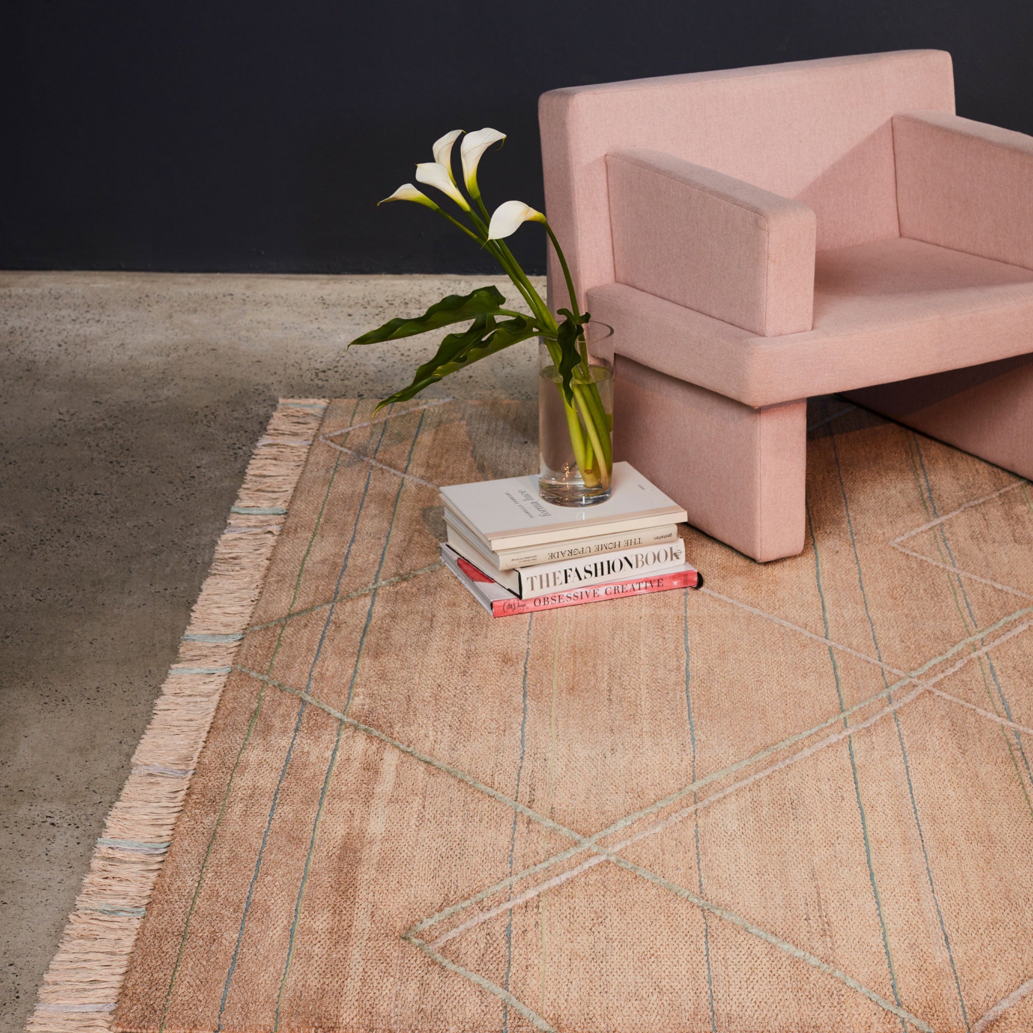 A soft hued fringe detail with sporadic coloured details adds gentle complexity to this rug.
