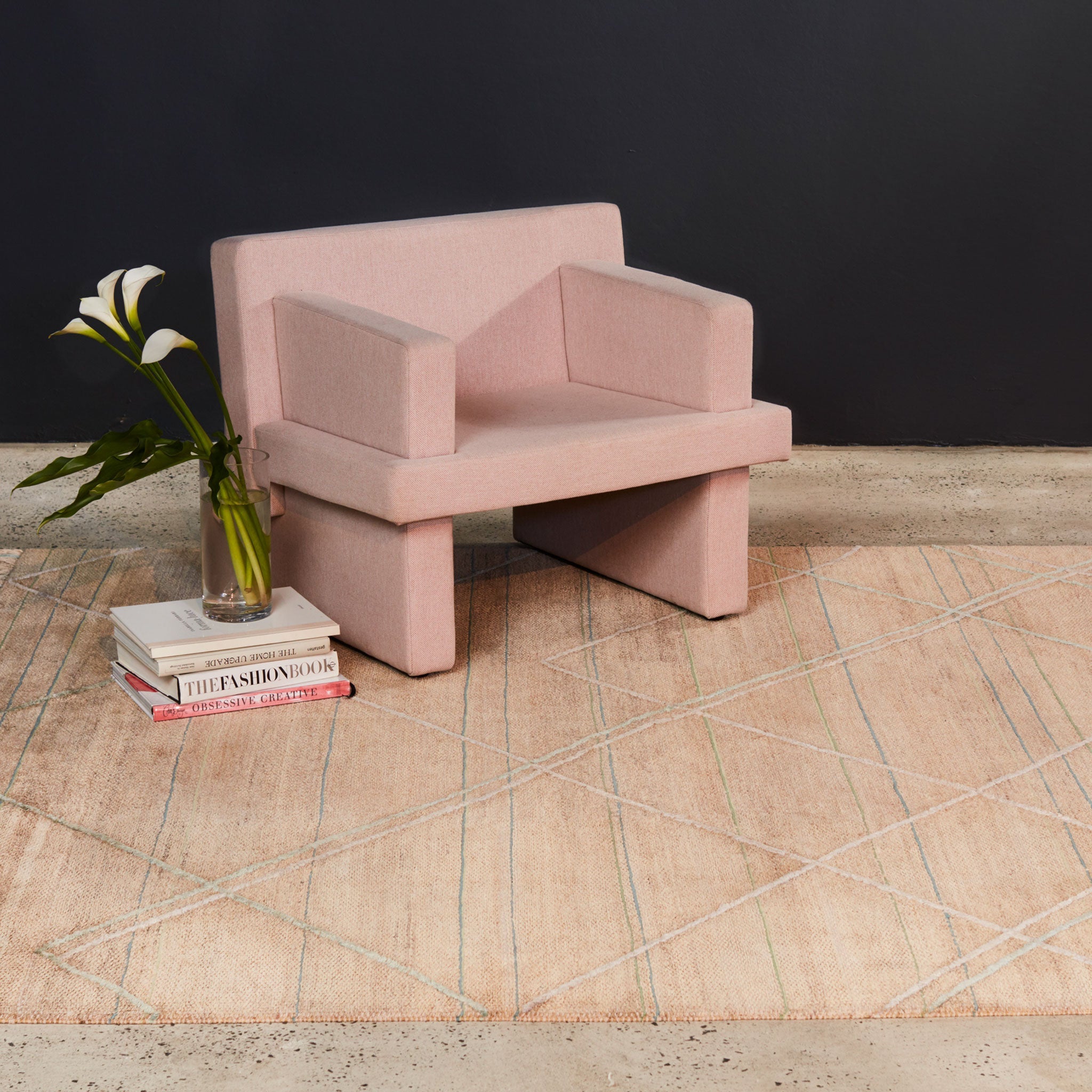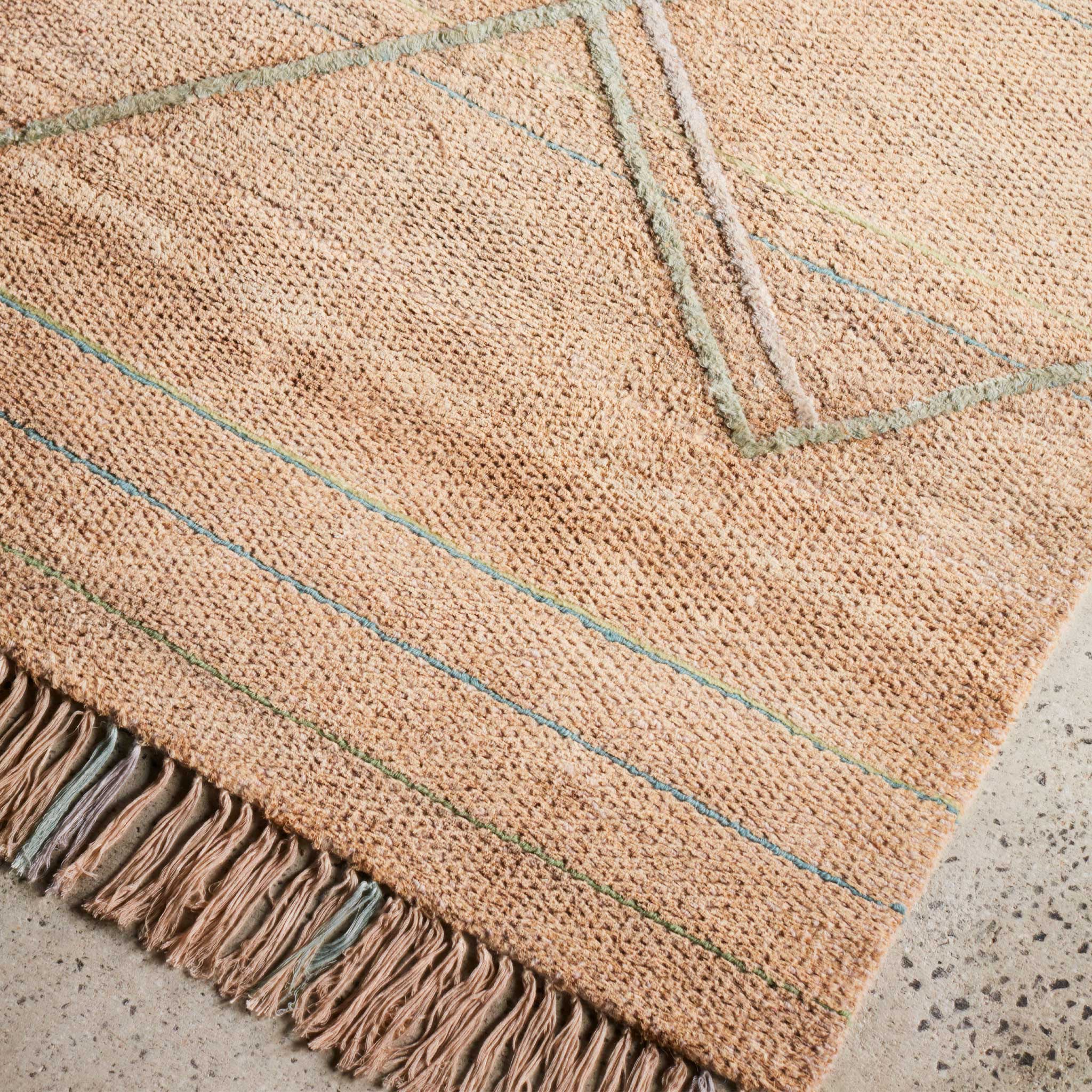 Natural hemp is paired with a neutral wool to create the base grid of this rug. A pastel palette comprising hues of blue, green, lilac and blush forms the linework offset at a 90 degree angle to the base within this design. With line work conceived in 2 layers loop pile and raised art-silk this rug has a dynamic movement.