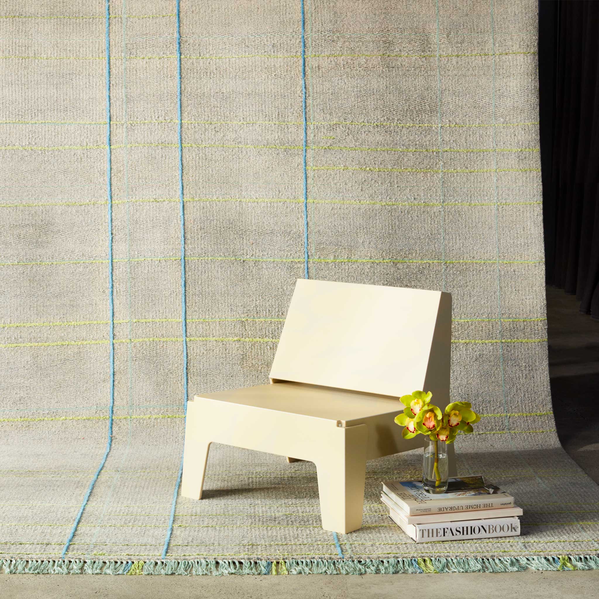 Silvery grey and sky blue are paired to create the base grid of this rug. A linear motif, inspired by a traditional plaid, of marine blues and acid green is distorted and reimagined with line work conceived in 2 layers loop pile and raised hemp this rug has a dynamic movement.
