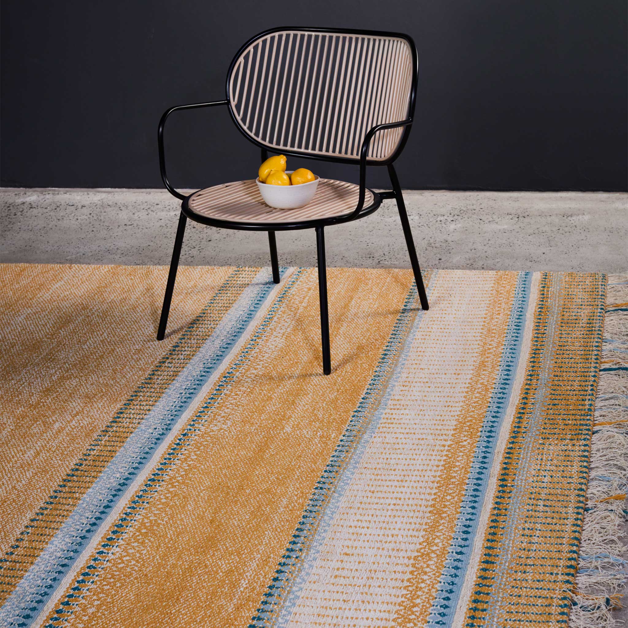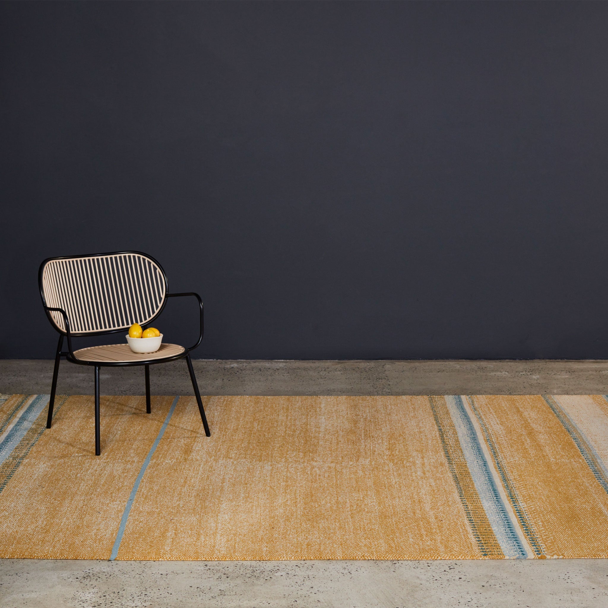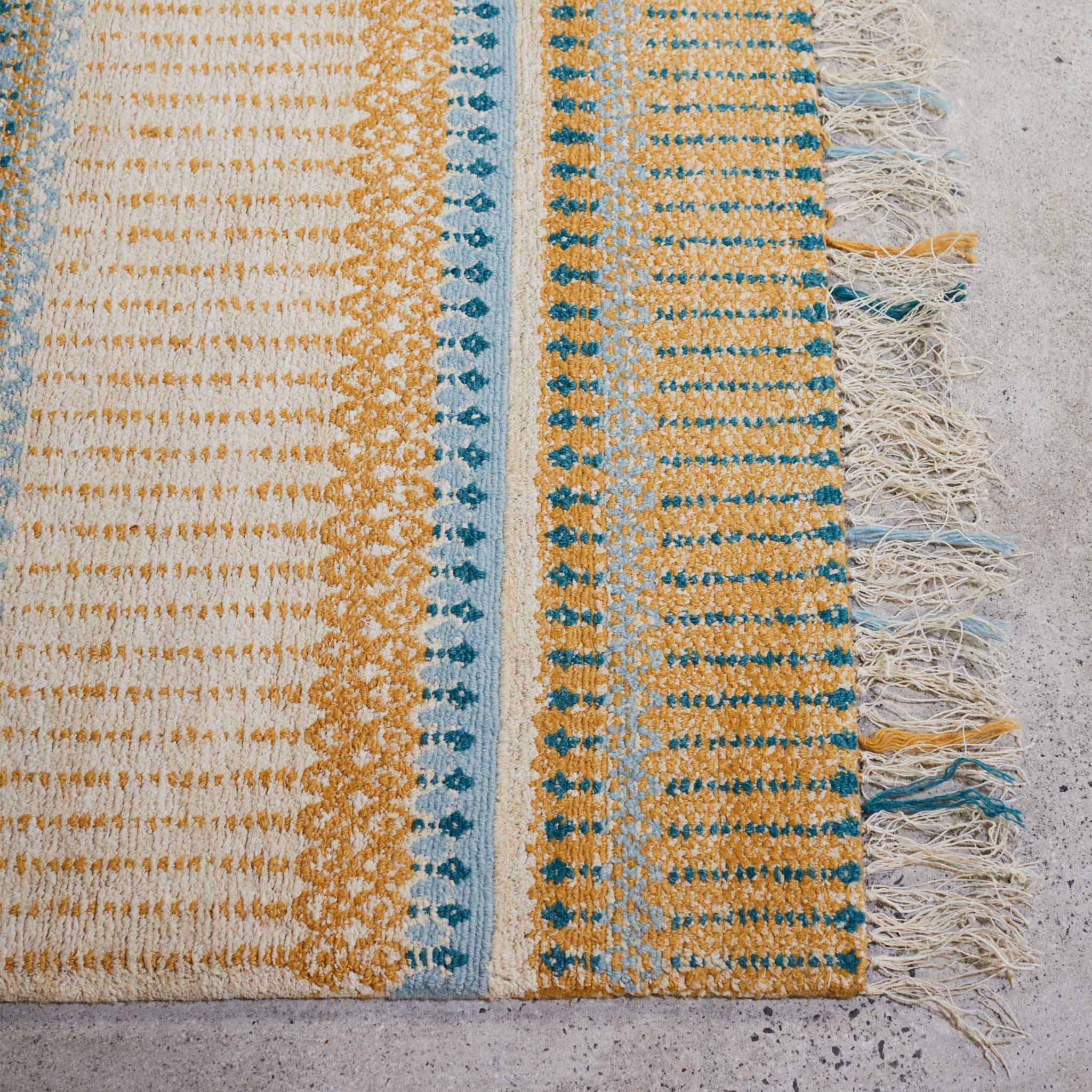 A fundamental simplicity and beauty veils complexity within, just as the luxurious expanse of a hand-knotted rug both reveals and conceals the meticulous craft of the artisan. A cheerful colour palette of sunny yellow, and winter white form the base layer of this rug, with powder and peacock blue highlight details. An intarsia inspired repeating pattern was built on the founding principle of the repeating square.