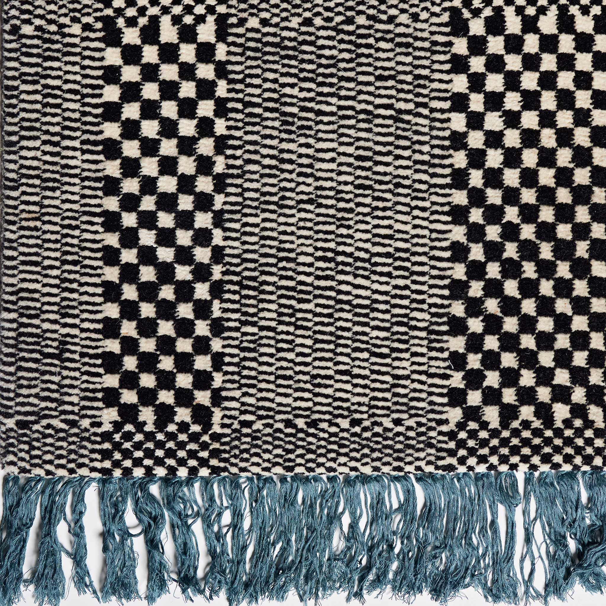The timeless and graphic colour palette of black and white is explored here in a classic checkerboard pattern that layers varying scales and distortions using a plaid inspired template.