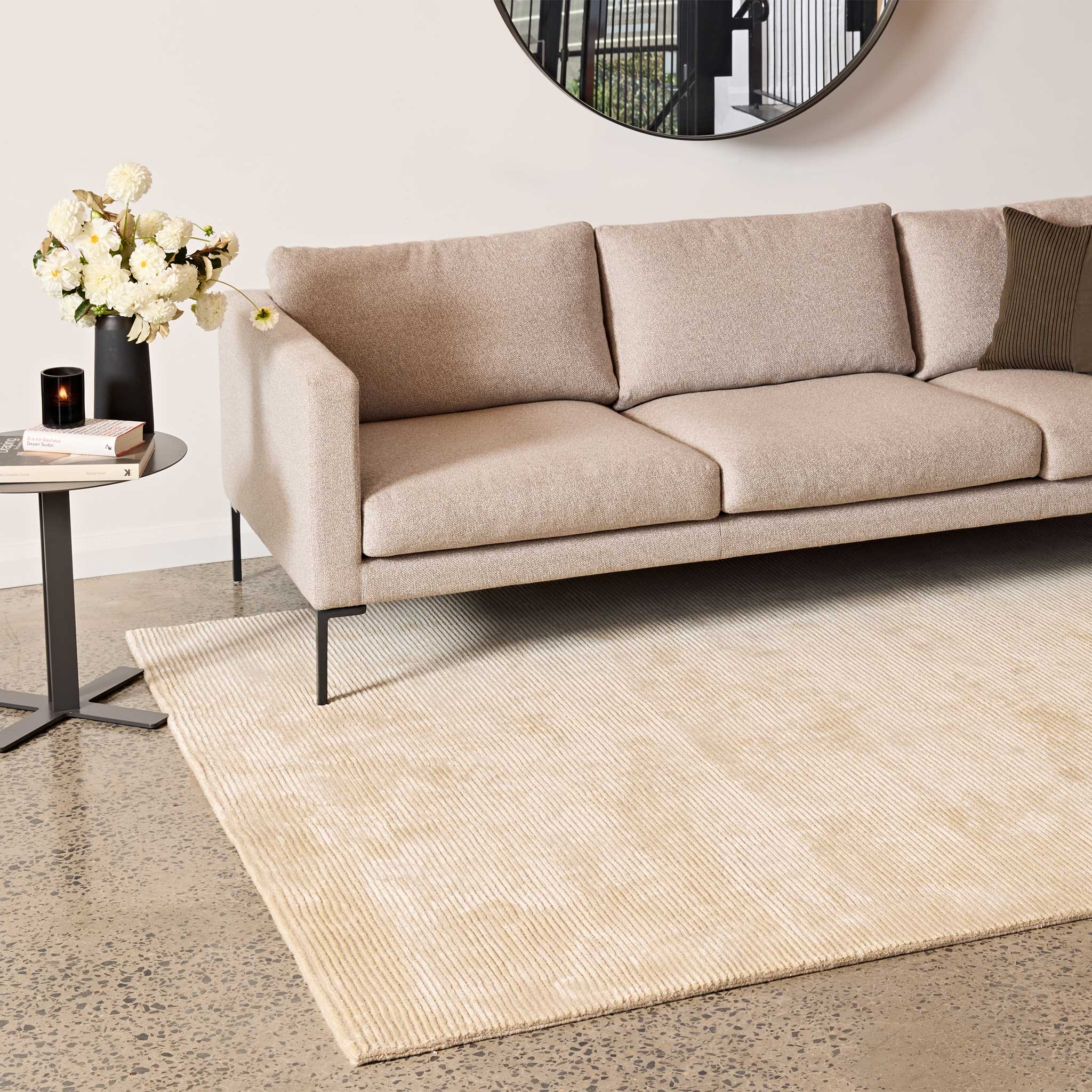 Hand-tufted with exceptional artistry, the Ora High Low Sand rug combines the grounding comfort of wool and the subtle luminosity of art-silk in both loop and cut piles. Manufactured to a refined pile height of 9mm with distinct 12mm raised lines, its construction creates a tactile experience that echoes the varied textures of a natural sandy expanse. The interplay of these varying pile heights allows light to subtly shift across the surface, much like sunlight dancing upon individual grains, revealing nuanced depths within its gentle color.