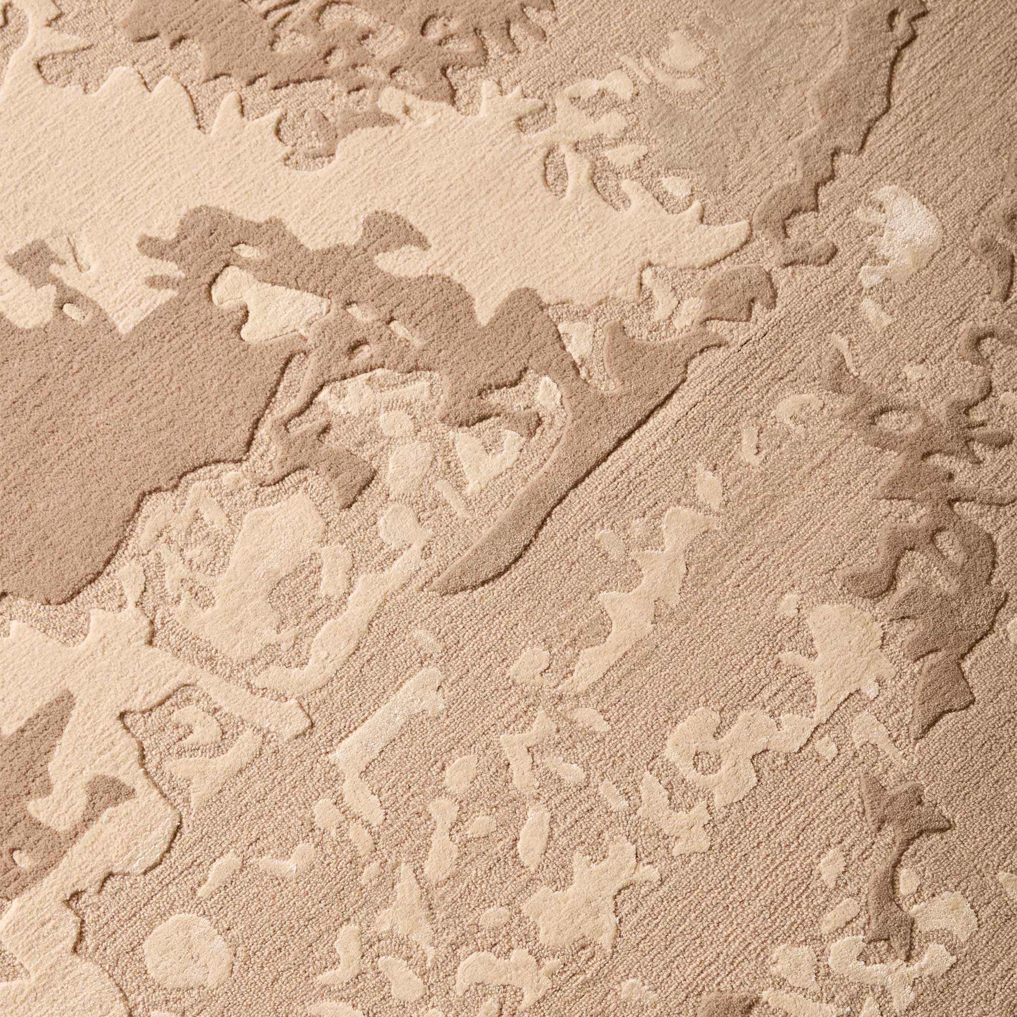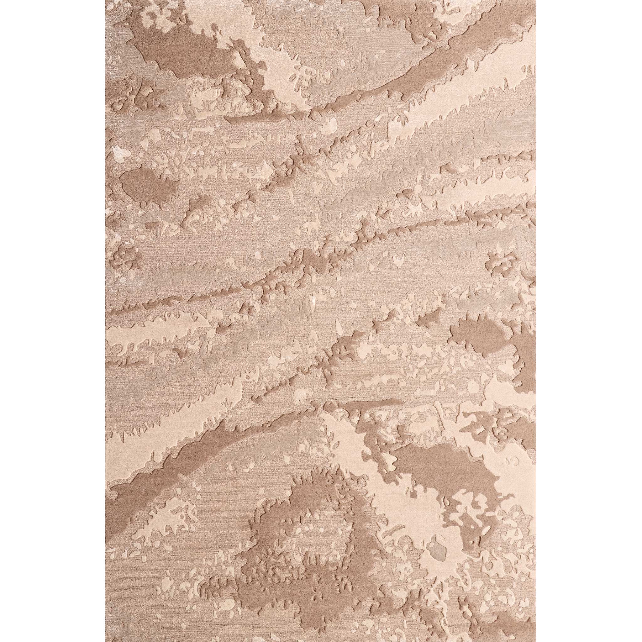 Hand-tufted with exceptional artistry, the Ora Himalayan rug combines the grounded robustness of wool and the subtle sheen of art-silk in both loop and cut piles. Manufactured to a pile height of 12mm, its construction creates a rich, three-dimensional surface. The interplay of loop and cut piles intricately sculpts the design, mirroring the rugged contours of natural rock formations and the smooth expanses of weathered earth. The tactile variations suggest the layered geological history and the ethereal play of light across a nuanced surface.