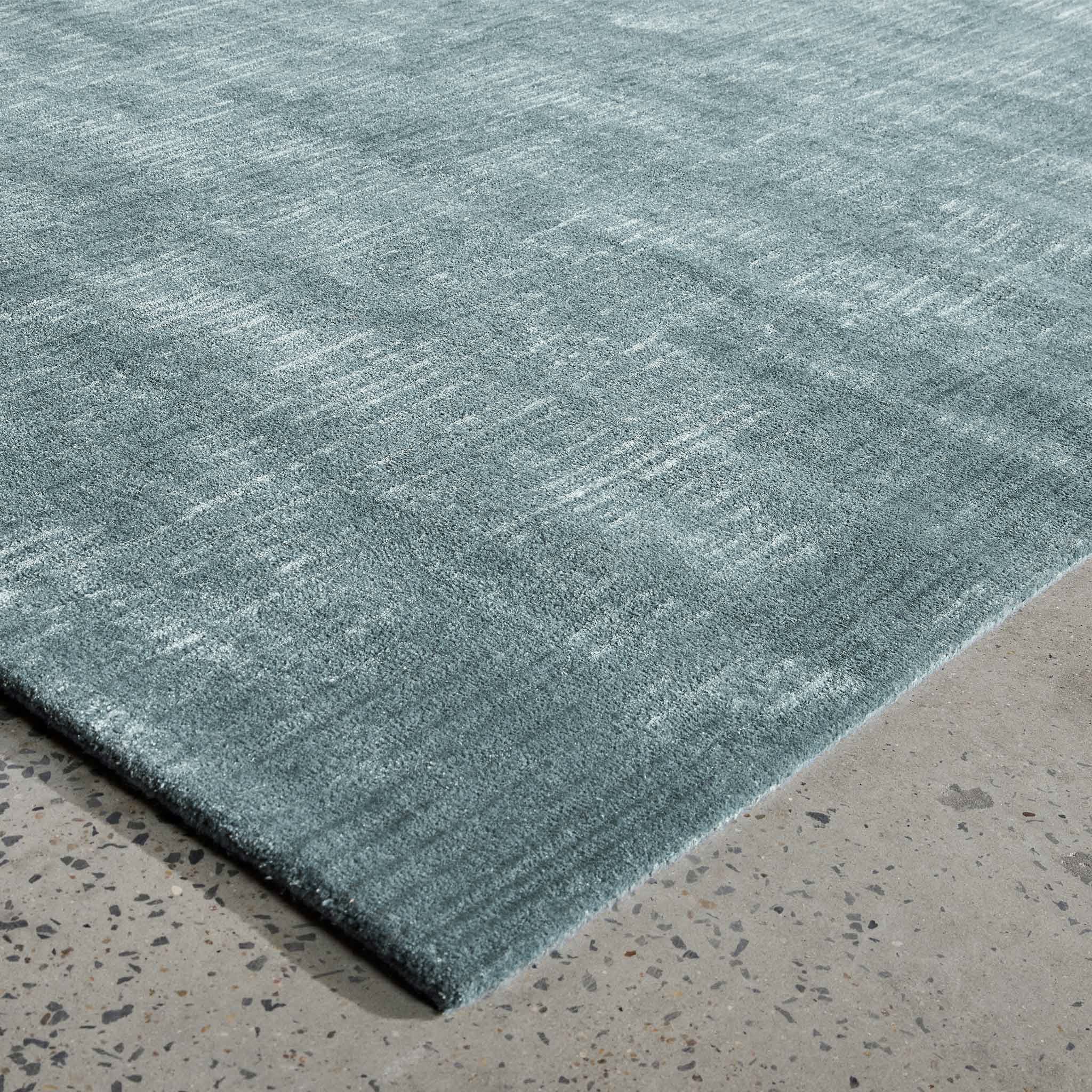 Unfurl the captivating flow of the Tappeti Ora Linea Denim rug, an approachable entry into world-class textile design. This piece draws its profound inspiration from the mesmerizing dance of wind moving effortlessly over water, translated into a rich denim hue. Organically formed lines of shimmering art-silk create a subtle undulation and movement across the surface, inviting a tactile sense of fluid motion.