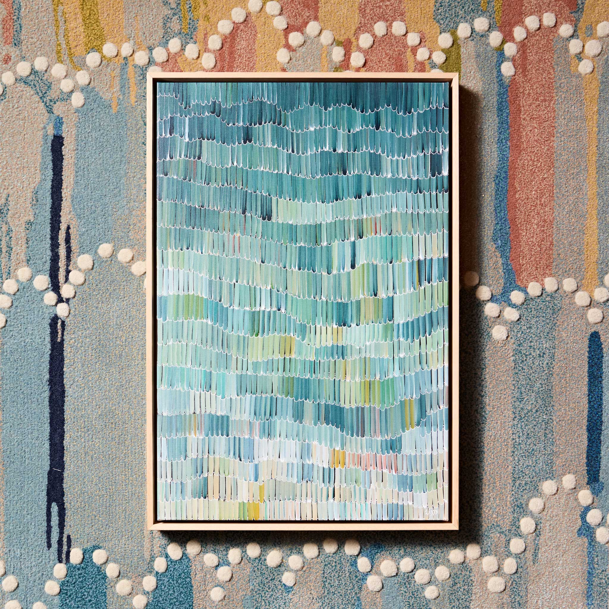 "The Sweet Rain series is designed to ignite imagination and celebrate life. It signifies a raindrop’s journey from the clouds to the earth and its importance to the land and our lives. The ancient traditional Aboriginal symbol of rain is portrayed through my own contemporary artistic lens. I have designed the symbol to have a cup of delicate dots that surround just the bottom of each coloured stroke, in a cascading effect. The colour of each drop signifies a part of my life story and is applied in layers of fine art strokes. The colours hold a visual memory of the beautiful Australian landscapes through my eyes.
