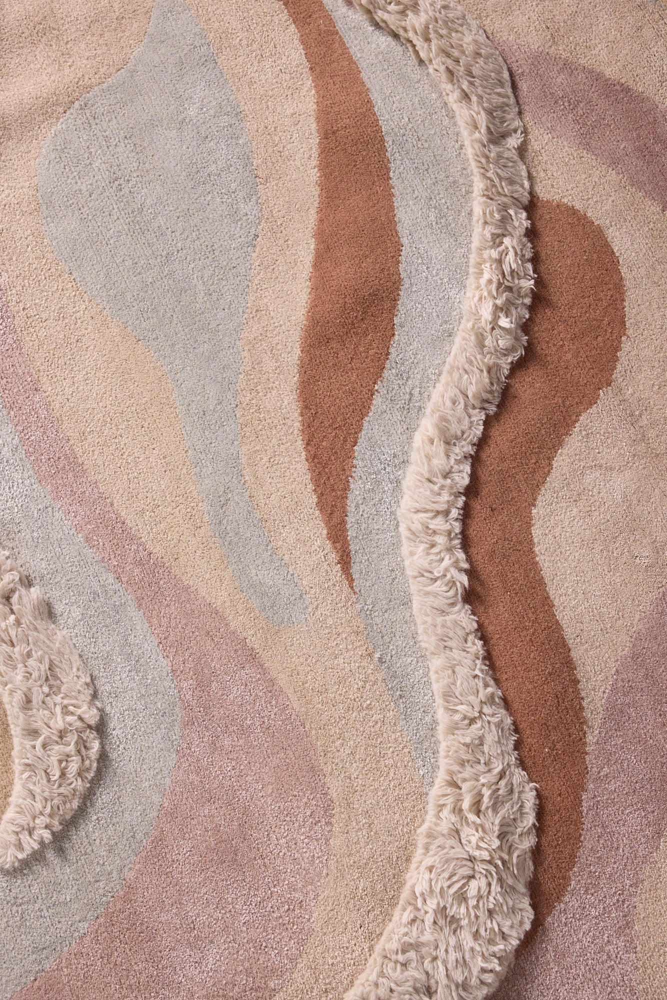 Behold the Petra Rose rug from Tappeti, a textile marvel hand-knotted to echo the breathtaking artistry of Jordan's ancient "Rose City." A swirling geological pattern, born from the union of Tibetan wool, hemp, and art-silk, unfolds before your eyes, evoking the very canyons carved by time. The interplay of long shaggy, regular, and lowered cut pile heights creates a tangible landscape, mirroring the carved stone textures that have stood for millennia. Soft, earthy rose shades infuse this creation with the warm hues that bathe Petra's majestic architecture in a perpetual twilight glow.